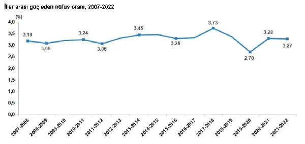 TÜİK, 2022 yılına ait iç göç istatistiklerini açıkladı. Buna göre; 2007-2008 döneminde yüzde 3,18 olan iller arası göç eden nüfus oranı, yıllar içinde inişli ve çıkışlı bir seyir izleyerek 2022 yılında yüzde 3,27 oldu. 2022 yılında 2 milyon 791 bin 156 kişi iller arasında göç etti. Bu nüfusun yüzde 47,9’unu erkekler, yüzde 52,1’ini ise kadınlar oluşturdu. İstanbul, 385 bin 294 kişi ile en çok göç alan il. 189 bin 104 kişi ile Ankara ikinci ve 132 bin 426 kişi ile İzmir üçüncü en çok göç alan il. En az göç alan iller 5 bin 391 kişi ile Ardahan, 7 bin 31 kişi ile Bayburt ve 8 bin 8 kişi ile Kilis. En çok göç veren iller de 418 bin 82 kişi ile İstanbul, 161 bin 912 kişi ile Ankara ve 107 bin 312 kişi ile İzmir. En az göç veren iller 7 bin 578 kişi ile Tunceli, 7 bin 629 kişi ile Kilis ve 8 bin 157 kişi ile Ardahan oldu.