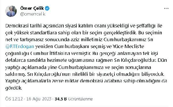 “Kılıçdaroğlu, CHP’ye gönül veren vatandaşlarımızın demokratik iradesini istismar etmeye devam ediyor. Bu iradeye saygı duymak yerine, kendi koltuğunu sağlama almak için çirkin sözlerle milli iradeye saldırıyor. CHP’ye gönül veren vatandaşlarımızın da tanıklığı ile Kılıçdaroğlu’nun gerçeklikle bağı kopmuş, siyasi tutumu demokrasi karşıtlığına dönüşmüştür. Terör odağı Kandil’in Cumhuriyeti yeniden kurma, siyasi özerklik, terörist başına imtiyazdan bahsettiği dönemde suskun kalan Kılıçdaroğlu’nun bugün söyledikleri siyaseten yok hükmündedir. Cumhurbaşkanımız Sayın Recep Tayyip Erdoğan ise aziz milletimizin her defasında artarak yinelenen desteği ile Cumhurbaşkanı olarak milletimize hizmet etmeye, ülkemizin hak ve menfaatlerinin korunmasına liderlik etmeye devam etmektedir.” (DHA)