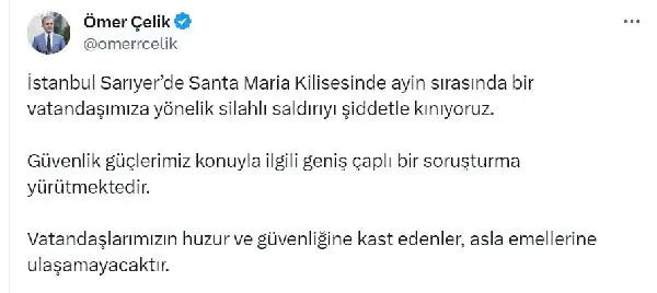 Kaan ULU/ANKARA, (DHA)- AK Parti Genel Başkan Yardımcısı ve Parti Sözcüsü Ömer Çelik, ”İstanbul Sarıyer’de Santa Maria Kilisesinde ayin sırasında bir vatandaşımıza yönelik silahlı saldırıyı şiddetle kınıyoruz” dedi.