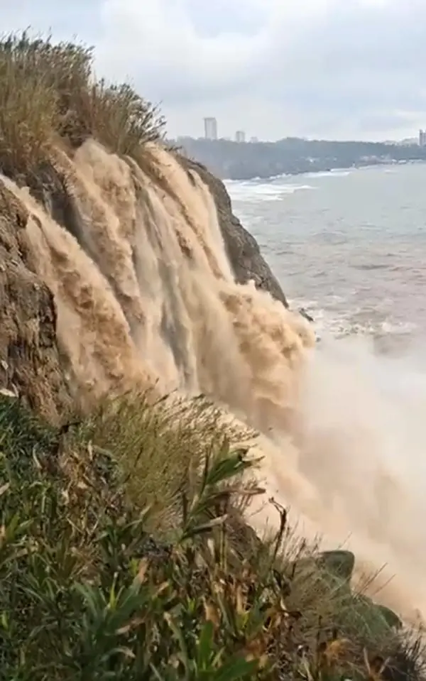 Sağanak sonrası, şiddetli akan Düden Şelalesi’nin rengi de kahverengiye döndü. Muratpaşa ilçesi Lara bölgesinden denize dökülen şelalede, tersten gelen rüzgar şelale sularını deniz yerine karaya savurdu. Şelalenin denizle buluştuğu noktaya gelenler, çamur gibi akan suyu görünce şaşkınlık yaşadı. Çamurlu su deniz üzerinde de kahverengi tabaka oluşturdu. (DHA)