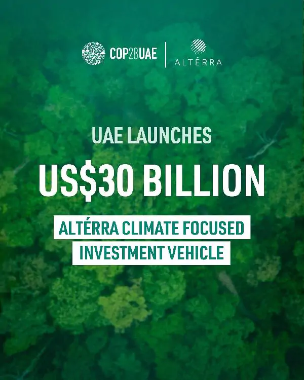 BAE Devlet Başkanı Al Nahyan öncülüğünde yeşil ekonomiye geçişi hızlandırmak ve iklim direncini arttırmak amacıyla COP28 sırasında başlatılan iklim odaklı yatırım aracı ALTERRA’ya 30 milyar dolar destek sağlandığı açıklandı. ALTERRA hakkında açıklama yapan BAE, “Bu 30 milyar ABD Doları tutarındaki taahhütle ALTERRA, iklim değişikliği eylemi için dünyanın en büyük özel yatırım aracı haline gelecek ve 2030 yılına kadar küresel olarak 250 milyar ABD Dolarını harekete geçirmeyi hedefleyecektir” denildi.