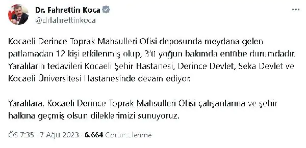 Bakan Koca, Twitter hesabından yaptığı paylaşımda, “Kocaeli Derince Toprak Mahsulleri Ofisi deposunda meydana gelen patlamadan 12 kişi etkilenmiş olup, 3’ü yoğun bakımda entübe durumdadır. Yaralıların tedavileri Kocaeli Şehir Hastanesi, Derince Devlet, Seka Devlet ve Kocaeli Üniversitesi Hastanesi’nde devam ediyor. Yaralılara, Kocaeli Derince Toprak Mahsulleri Ofisi çalışanlarına ve şehir halkına geçmiş olsun dileklerimizi sunuyoruz” ifadelerine yer verdi. (DHA)
