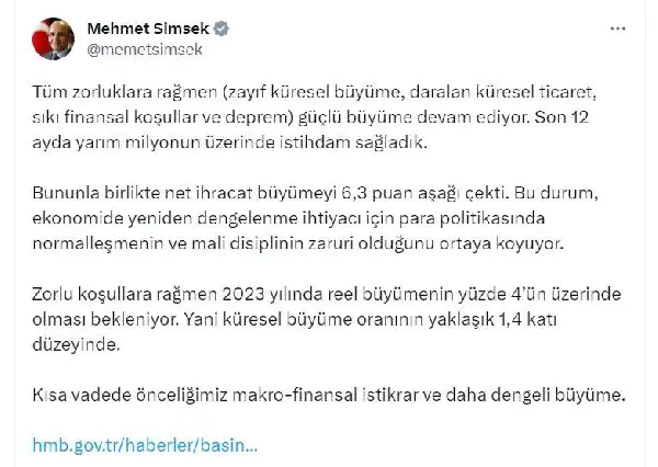 Hazine ve Maliye Bakanı Mehmet Şimşek, sosyal medya hesabından da yaptığı açıklamada, “Tüm zorluklara rağmen (zayıf küresel büyüme, daralan küresel ticaret, sıkı finansal koşullar ve deprem) güçlü büyüme devam ediyor. Son 12 ayda yarım milyonun üzerinde istihdam sağladık. Bununla birlikte net ihracat büyümeyi 6,3 puan aşağı çekti. Bu durum, ekonomide yeniden dengelenme ihtiyacı için para politikasında normalleşmenin ve mali disiplinin zaruri olduğunu ortaya koyuyor. Zorlu koşullara rağmen 2023 yılında reel büyümenin yüzde 4’ün üzerinde olması bekleniyor. Yani küresel büyüme oranının yaklaşık 1,4 katı düzeyinde. Kısa vadede önceliğimiz makro-finansal istikrar ve daha dengeli büyüme” dedi. (DHA)