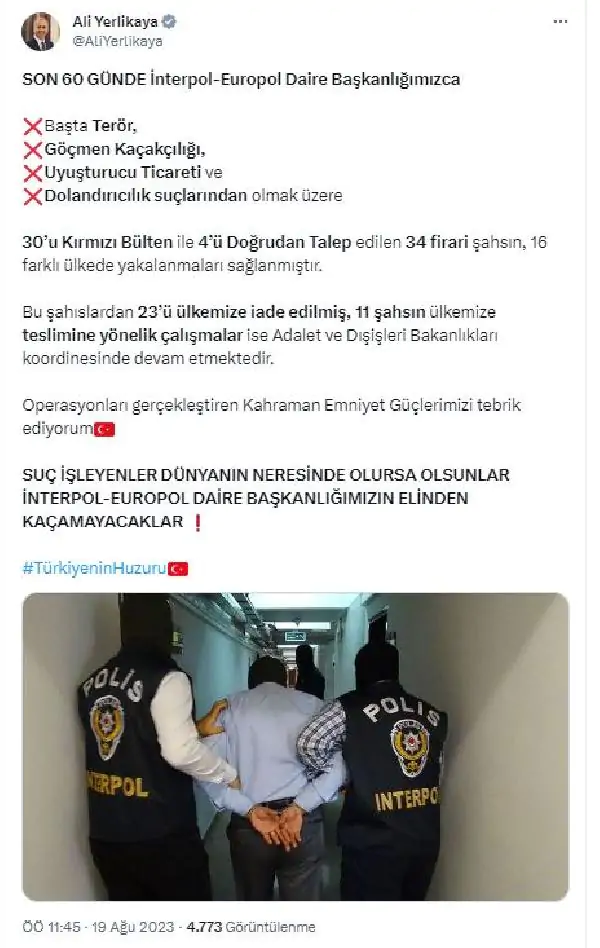 İçişleri Bakanı Ali Yerlikaya, sosyal medya hesabından yaptığı açıklamada, “Son 60 günde İnterpol-Europol Daire Başkanlığımızca, başta terör, göçmen kaçakçılığı, uyuşturucu ticareti ve dolandırıcılık suçlarından olmak üzere 30’u kırmızı bülten ile 4’ü doğrudan talep edilen 34 firari şahsın, 16 farklı ülkede yakalanmaları sağlanmıştır. Bu şahıslardan 23’ü ülkemize iade edilmiş, 11 şahsın ülkemize teslimine yönelik çalışmalar ise Adalet ve Dışişleri Bakanlıkları koordinesinde devam etmektedir. Operasyonları gerçekleştiren kahraman emniyet güçlerimizi tebrik ediyorum. Suç işleyenler dünyanın neresinde olursa olsunlar İnterpol-Europol Daire Başkanlığı’mızın elinden kaçamayacaklar” dedi. (DHA)