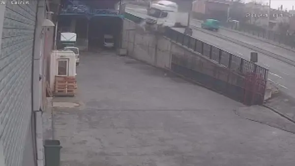 Olay, cumartesi günü saat 10.00 sıralarında İkitelli Organize Sanayi Bölgesi Eski Turgut Özal Caddesi’nde meydana geldi. Caddeye girdiği sırada virajı alamayan TIR, önce refüje çıktı ardından bariyerleri aşarak 5 metre yükseklikten bir iş yerinin önüne düştü. Hafta sonu olması nedeniyle iş yerinin kapalı olması nedeniyle faciadan dönüldü. TIR şoförü yara almadan aracından çıktı. Kaza anı iş yerinin güvenlik kamerasına saniye saniye yansıdı.