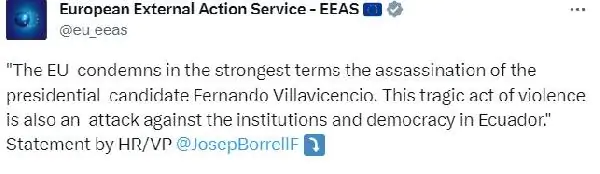 BELÇİKA, (DHA)- Avrupa Birliği (AB) Dış İlişkiler ve Güvenlik Politikaları Yüksek Temsilcisi Josep Borrell, AB’nin, Ekvador’da yaklaşan başkanlık seçimlerinde devlet başkanı adayı Fernando Villavicencio’nun suikast sonucu öldürülmesini kınadığını belirterek, “Bu trajik şiddet eylemi aynı zamanda Ekvador’daki kurumlara ve demokrasiye yönelik bir saldırıdır” dedi.
