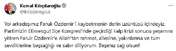 CHP Genel Başkanı Kemal Kılıçdaroğlu, partisinin Etimesgut Kongresi’nde kalp krizi geçirerek hayatını kaybeden eski ilçe başkanı Faruk Özdemir için Twitter üzerinden taziye mesajı yayımladı. Kılıçdaroğlu, “Yol arkadaşımız Faruk Özdemir’i kaybetmenin derin üzüntüsü içindeyiz. Partimizin Etimesgut İlçe Kongresi’nde geçirdiği kalp krizi sonucu yaşamını yitiren Faruk Özdemir’e Allah’tan rahmet, ailesine, yakınlarına ve tüm sevdiklerine başsağlığı ve sabır diliyorum. Başımız sağ olsun!” dedi. (DHA)