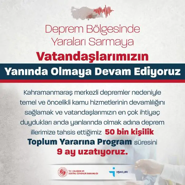 ANKARA, (DHA)- ÇALIŞMA ve Sosyal Güvenlik Bakanı Vedat Işıkhan, depremden etkilenen illerde uygulanan 50 bin kişilik ‘Toplum Yararına Program’ süresinin 9 ay uzatıldığını duyurdu.
