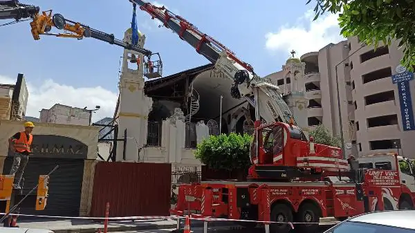 Ufuk AKTUĞ/İSKENDERUN (Hatay), (DHA)- HATAY’ın İskenderun ilçesinde depremde ağır hasar gören Aziz Nikola Rum Ortodoks Kilisesi’nin iki çan kulesi, risk teşkil ettiği için bulunduğu yerden kaldırıldı.