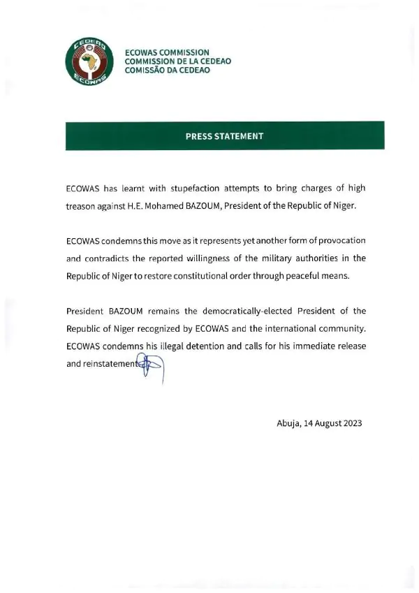 ECOWAS’tan yapılan açıklamada, “ECOWAS, Devlet Başkanı Muhammed Bazum’a karşı vatana ihanet suçlamasında bulunulmaya çalışıldığını şaşkınlıkla öğrenmiştir. ECOWAS, bir başka provokasyon biçimini temsil ettiği ve Nijer’deki askeri makamların anayasal düzeni barışçıl yollarla yeniden tesis etme yönünde daha önce bildirilen istekliliğiyle çeliştiği için bu hareketi kınamaktadır” denildi.