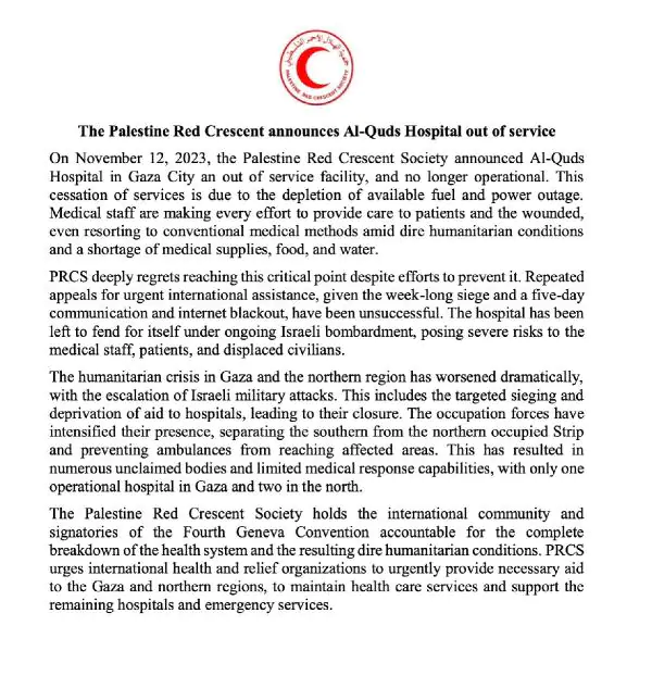 Filistin Kızılayı’ndan yapılan açıklamada, “Filistin Kızılayı Gazze’deki Al Quds hastanesinin hizmet dışı kaldığını ve artık faaliyet göstermediğini duyurmaktadır. Hizmetlerin durdurulması, mevcut yakıtın tükenmesi ve elektrik kesintisinden kaynaklanmaktadır. Sağlık personeli, korkunç insani koşullar ve tıbbi malzeme, gıda ve su sıkıntısı nedeniyle geleneksel tıbbi yöntemlere geri dönerek bile hastalara ve yaralılara bakım sağlamak için her türlü çabayı göstermektedir” denildi.