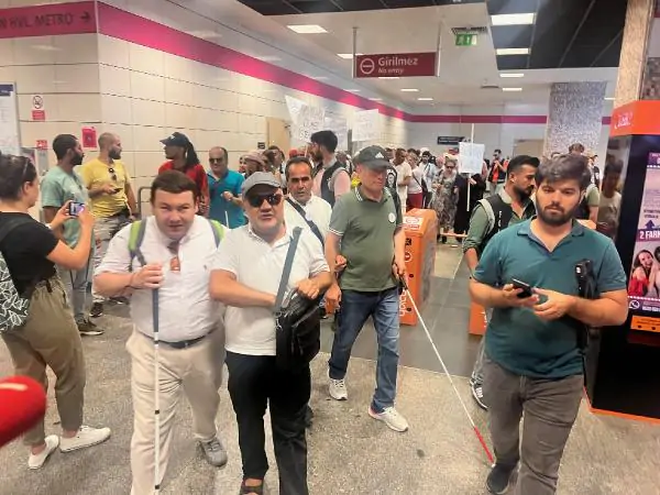 Türkiye Görme Engelliler Derneği üyesi yaklaşık 50 kişilik grup, Kadıköy’den metroya binerek Marmaray Ayrılıkçeşmesi durağına geldi. Ellerindeki dövizlerle sloganlar atan grup, istasyonlarda daha güvenli yolculuk yapabilmeleri için bariyer kurulmasını talep etti.
