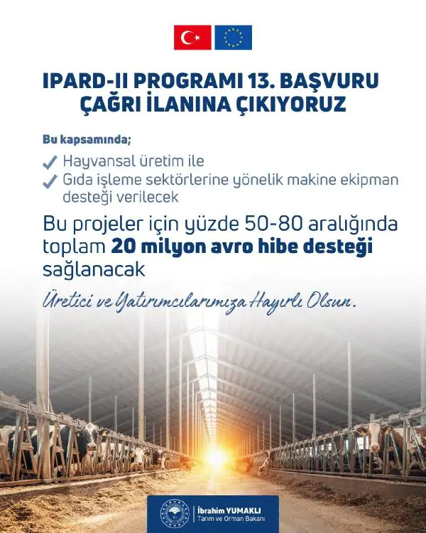 13’üncü çağrı ilanı; Afyonkarahisar, Ağrı, Aksaray, Amasya, Ankara, Ardahan, Aydın, Balıkesir, Burdur, Bursa, Çanakkale, Çankırı, Çorum, Denizli, Diyarbakır, Elazığ, Erzincan, Erzurum, Giresun, Hatay, Isparta, Kahramanmaraş, Karaman, Kars, Kastamonu, Konya, Kütahya, Malatya, Manisa, Mardin, Mersin, Muş, Nevşehir, Ordu, Samsun, Sivas, Şanlıurfa, Tokat, Trabzon, Uşak, Van ve Yozgat illerinde uygulanan IPARD II Programı kapsamında çıkılan son başvuru çağrısı olacak. Başvurular ile ilgili detaylara, projenin yürütücüsü Tarım Reformu Genel Müdürlüğünün ‘https://ipard.tarim.gov.tr/’ ile projenin uygulayıcısı TKDK’nın ‘https://www.tkdk.gov.tr/’ internet adresleri üzerinden ulaşılabilecek.