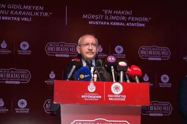 Kılıçdaroğlu, “Bir ülkede adalet varsa onun etrafında biliniz ki hukukun üstünlüğü can ve mal güvenliği, şeffaflık, eşitlik, kadın erkek eşitliği, çocuğun üstün yararı, liyakat, özgürlük, hakça bölüşüm, emeğin üstünlüğü, nitelikli ve kaliteli eğitim, insan ve doğa hakları vardır. Sevgili dostlarım, Hacıbektaş-i Veli bu topraklarda yaşayıp anlayana çok şey söyledi. Çağlar ötesinden onun söyledikleri bugün kainatın evrensel kurallarına dönüşmüş durumda. Bugün Hacıbektaş-i Veli’nin söylediklerinden çok uzaktaysak, o güzellikleri nerede yitirdiysek onları arayıp bulmalıyız” diye konuştu.