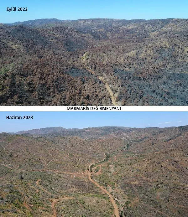 Şaduman TÜRKAY/ANKARA, (DHA)-MUĞLA’nın Marmaris ilçesinde çıkan orman yangınlarında küle dönen Bördübet ve Değirmenyanı bölgeleri, 1 yıl sonra Orman Genel Müdürlüğü’nün (OGM) çalışması ile yeniden yeşillendi.