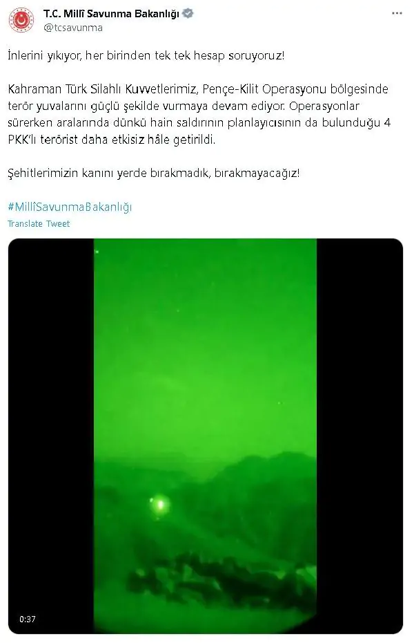 Bakanlığın sosyal medya hesabından yapılan açıklamada, “İnlerini yıkıyor, her birinden tek tek hesap soruyoruz. Kahraman Türk Silahlı Kuvvetlerimiz, Pençe-Kilit Operasyonu bölgesinde terör yuvalarını güçlü şekilde vurmaya devam ediyor. Operasyonlar sürerken, aralarında dünkü hain saldırının planlayıcısının da bulunduğu 4 PKK’lı terörist daha etkisiz hale getirildi. Şehitlerimizin kanını yerde bırakmadık, bırakmayacağız” denildi. (DHA)