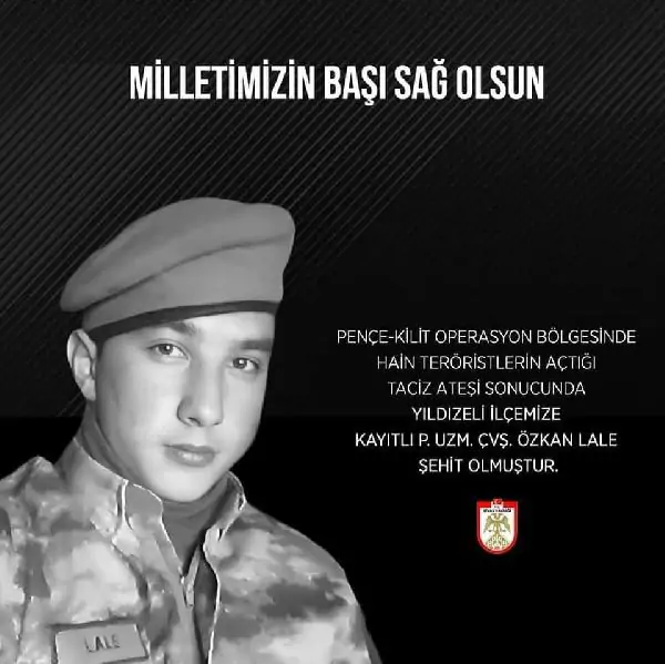 Sivas’ın Yıldızeli ilçesi nüfusuna kayıtlı Piyade Uzman Çavuş Özkan Lale, görev yaptığı Pençe Kilit Harekatı bölgesinde teröristlerin uzun namlu silahlarla açtığı taciz ateşi sonucu şehit düştü. Şehit haberini Sivas Valiliği sosyal medya hesabından duyurdu. Acılı haber şehidin Yıldızeli ilçesinde yaşayan ailesine iletildi. Şehidin baba ocağına Türk bayrakları asılırken, yakınları taziye ziyaretine geldi. Şehidin cenazesinin Yıldızeli ilçesinde toprağa verileceği öğrenildi. (DHA)