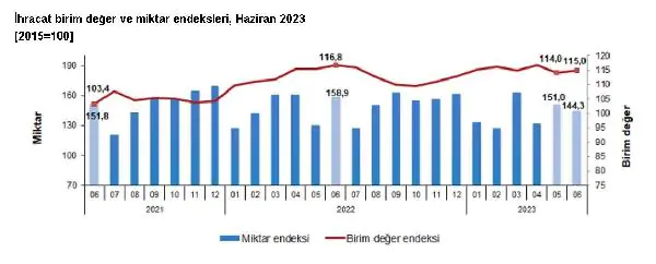 TÜİK, Haziran 2023 dönemine ilişkin dış ticaret endekslerini açıkladı. Buna göre; ihracat birim değer endeksi haziranda bir önceki yılın aynı ayına göre yüzde 1,6 azaldı. Endeks, gıda, içecek ve tütünde yüzde 3,6 ve imalat sanayinde (gıda, içecek, tütün hariç) yüzde 1,8 artarken; ham maddelerde (yakıt hariç) yüzde 13,6 ve yakıtlarda yüzde 39,8 azaldı. İhracat birim değer endeksi, 2023’ün ikinci çeyreğinde bir önceki yılın ikinci çeyreğine göre yüzde 0,7 azaldı. İhracat miktar endeksi haziranda bir önceki yılın aynı ayına göre yüzde 9,2 azaldı. Endeks, gıda, içecek ve tütünde yüzde 11,4, ham maddelerde (yakıt hariç) yüzde 18,9 ve imalat sanayinde (gıda, içecek, tütün hariç) yüzde 11,4 azalırken; yakıtlarda yüzde 22,3 arttı. İhracat miktar endeksi 2023’ün ikinci çeyreğinde bir önceki yılın ikinci çeyreğine göre yüzde 5,1 azaldı.