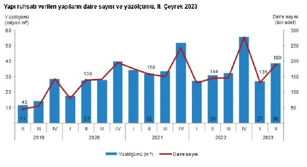 TÜİK, 2023’ün ikinci çeyreğine ilişkin yapı izin istatistiklerini açıkladı. Buna göre; bir önceki yılın aynı çeyreğine göre, belediyeler tarafından yapı ruhsatı verilen bina sayısı yüzde 5,7, daire sayısı yüzde 31,3 ve yüz ölçümü yüzde 25,6 arttı. Bu dönemde ruhsat verilen 38,6 milyon metrekare yüz ölçümünün, 20 milyon metrekaresi konut, 10,1 milyon metrekaresi konut dışı ve 8,4 milyon metrekaresi ise ortak kullanım alanı. En yüksek yüz ölçümü payı 25,6 milyon metrekare ile 2 ve daha fazla daireli ikamet amaçlı binalara verilirken; 3,9 milyon metrekare ile sanayi binaları ve depolar izledi.