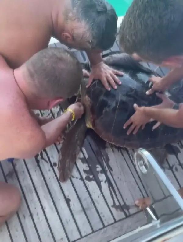 Günübirlik tekne turları düzenleyen kaptan Turgay Meşe, Alanya Kalesi civarında su yüzeyinde çırpınan deniz kaplumbağasını fark etti. Hemen denize atlayan Meşe, çırpınan hayvanı tekneye çıkardı. Deniz kaplumbağasının ağzına balık iğnesi saplandığı, yüzgeçlerine de misina dolandığı görüldü. Meşe ile teknedeki yerli ve yabancı tatilciler, yaralı hayvanı kurtarmak için seferber oldu. Önce yüzgeçlerine dolanan misinadan, sonra da ağzındaki balık iğnesinden kurtarılan kaplumbağa denize bırakıldı. Bu anlar, cep telefonu kamerasıyla kaydedildi. (DHA)
