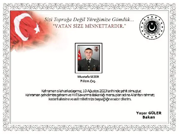 Milli Savunma Bakanı Yaşar Güler de yayımladığı başsağlığı mesajında, “Kahraman silah arkadaşımız, 10 Ağustos 2023 tarihinde şehit olmuştur. Kahraman şehidimize şahsım ve MSB mensupları adına Allah’tan rahmet; kederli ailesine ve asil milletimize başsağlığı ve sabır dilerim” dedi. (DHA)